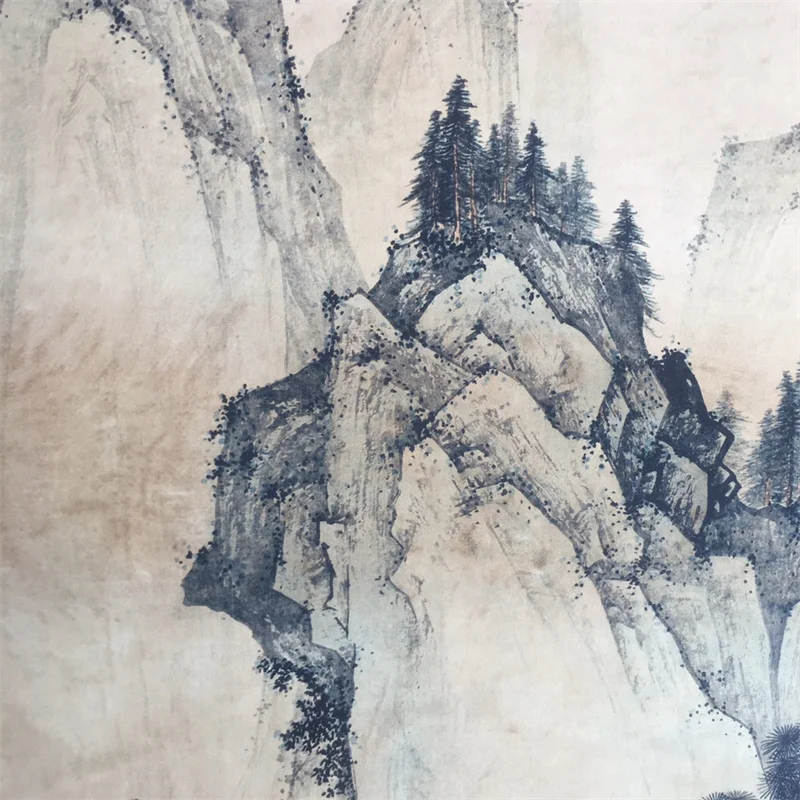 Configuração de cores: A configuração geral de cores é elegante, com tinta como cor principal, complementada por cores claras.Os galhos das pinheiras são de cor marrom, as agulhas de pinheiro são pretas escuras e as partes rochosas são principalmente cinza claro e azul claro, criando uma atmosfera pitoresca e pacífica.