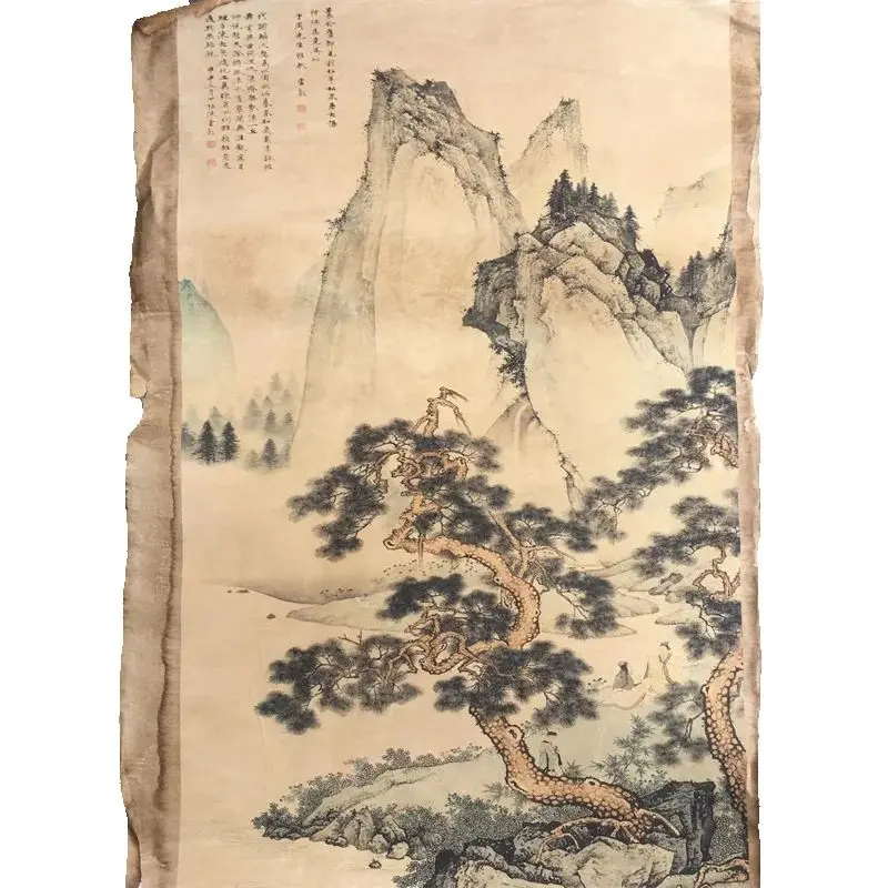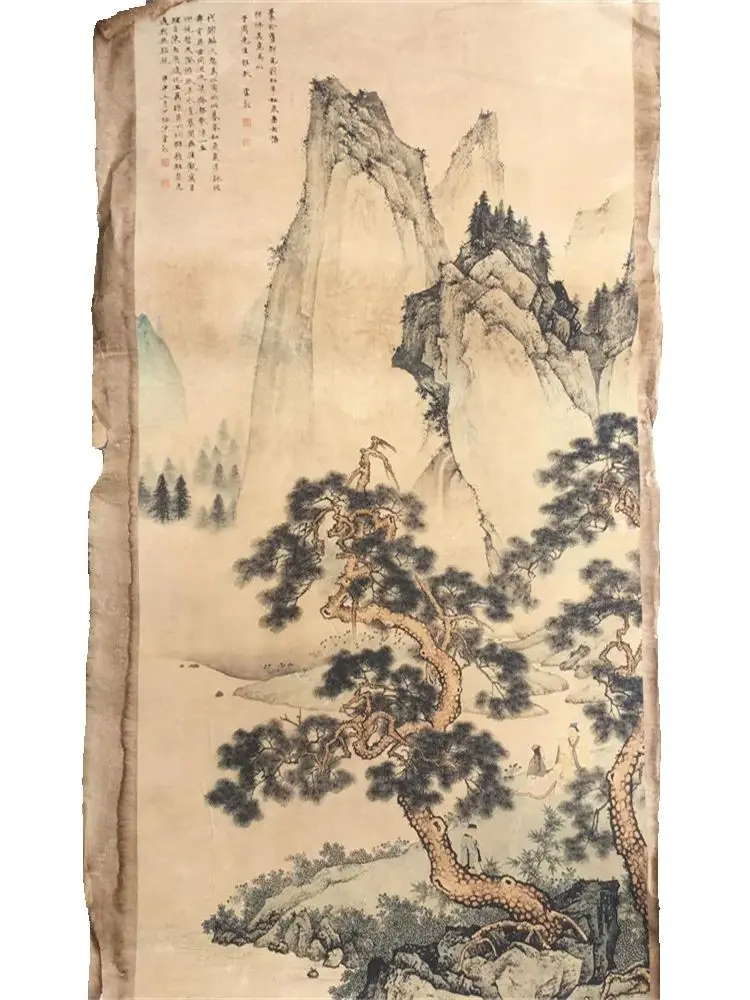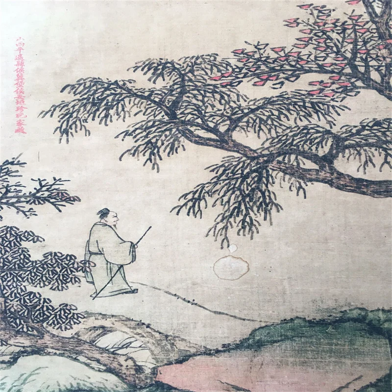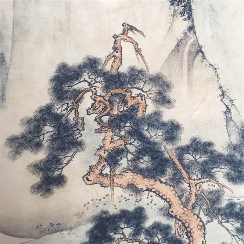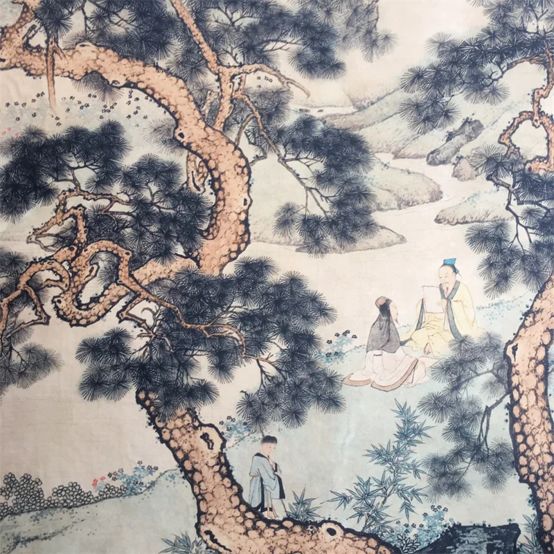 Esta pintura mostra o amor dos antigos literários chineses pela natureza e a busca por uma vida tranquila, retratando pinheiros, paisagens e figuras.As pinheiras simbolizam qualidades como perseverança e longevidade na cultura chinesa, enquanto montanhas e águas representam a tranquilidade e a harmonia da natureza.Toda a pintura transmite uma concepção artística serena e extraordinária.