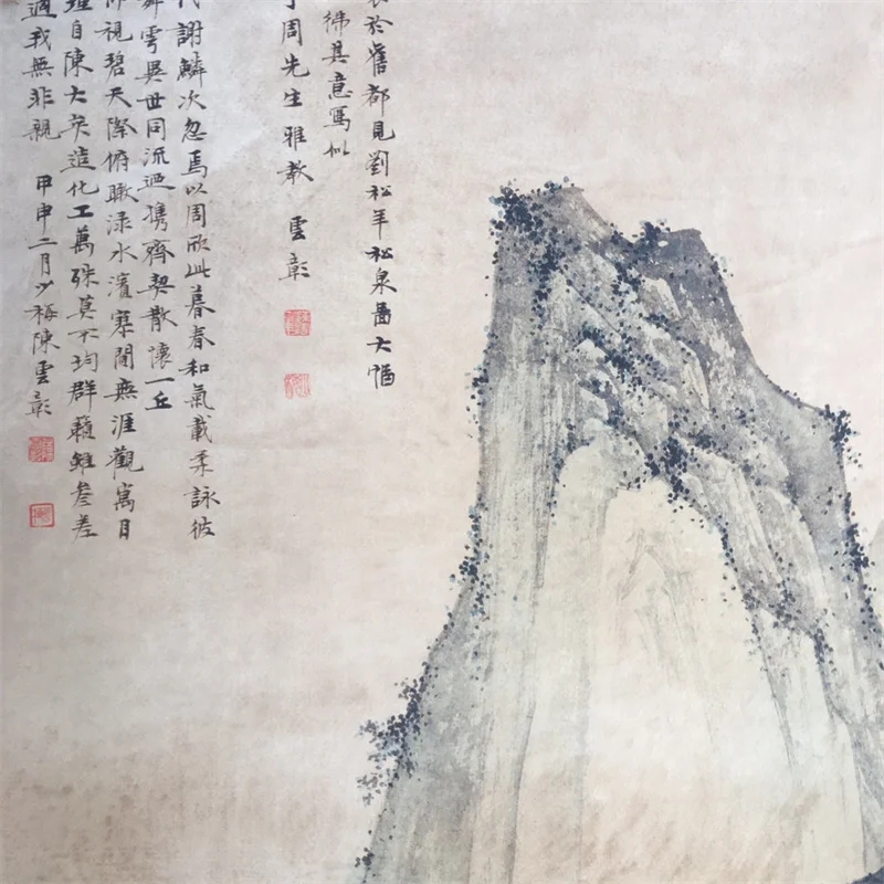 No lado esquerdo da tela há uma inscrição que lê: “Eu vi uma foto da mola de pinho de Liu Songnian na antiga capital, que é grande, e escrevei de acordo com seu significado.O Sr. Zhou é elegante e elegante, e as nuvens são proeminentes."Existem também alguns conteúdos poéticos, com a inscrição datada de “Febramento de Jiashen” e assinada por “Shaomei Chen Yunzhang” e estampada com selo vermelho.Do título, pode-se observar que esta pintura foi criada pelo autor inspirada no "Song Quan Tu" de Liu Songnian e dotada de "Sr. Xiao Zhou" para consulta.O termo 'Shaomei Chen Yunzhang' mencionado aqui pode se referir ao Chen Shaomei, que era um pintor importante no mundo da arte norte durante a República da China.Foi habilidoso em pintar paisagens e figuras, com um estilo delicado e antigo.